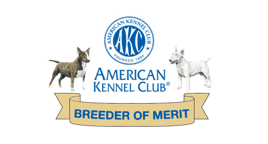I also breed for a "showy" personality, this means Nuance Bull Terriers tend to be smarter and more active than some, which can present more challenge but also means they easier to motivate when training and often have an extra dose of Bully charisma. When I learned of the AKC's Breeder of Merit program in December 2010, which recognizes breeders who have been active and successful in AKC activities and promote the good health and AKC registration of their dogs, I applied for and was accepted into the program.