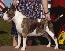 Nikki was the #1 Colored Bull Terrier bitch in both breed and all breed points in 2005, and #2 to Rufus overall. She is a three time Silverwood finalist and is shown here finishing her championship at the Golden Triangle BTC specialty in 2004.